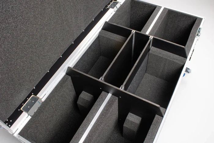 Das Antari M-4 Stage Fog Jet Flightcase verfügt über 4 Einzelfächer mit Schaumstoffpolsterung bei der Wireless Reciver und Öse ausgespart sind. In der Mitte befinden sich zwei Fächer für insgesamt 4 Fluid Kanister sowie ein Zubehörfach für Kabel etc.