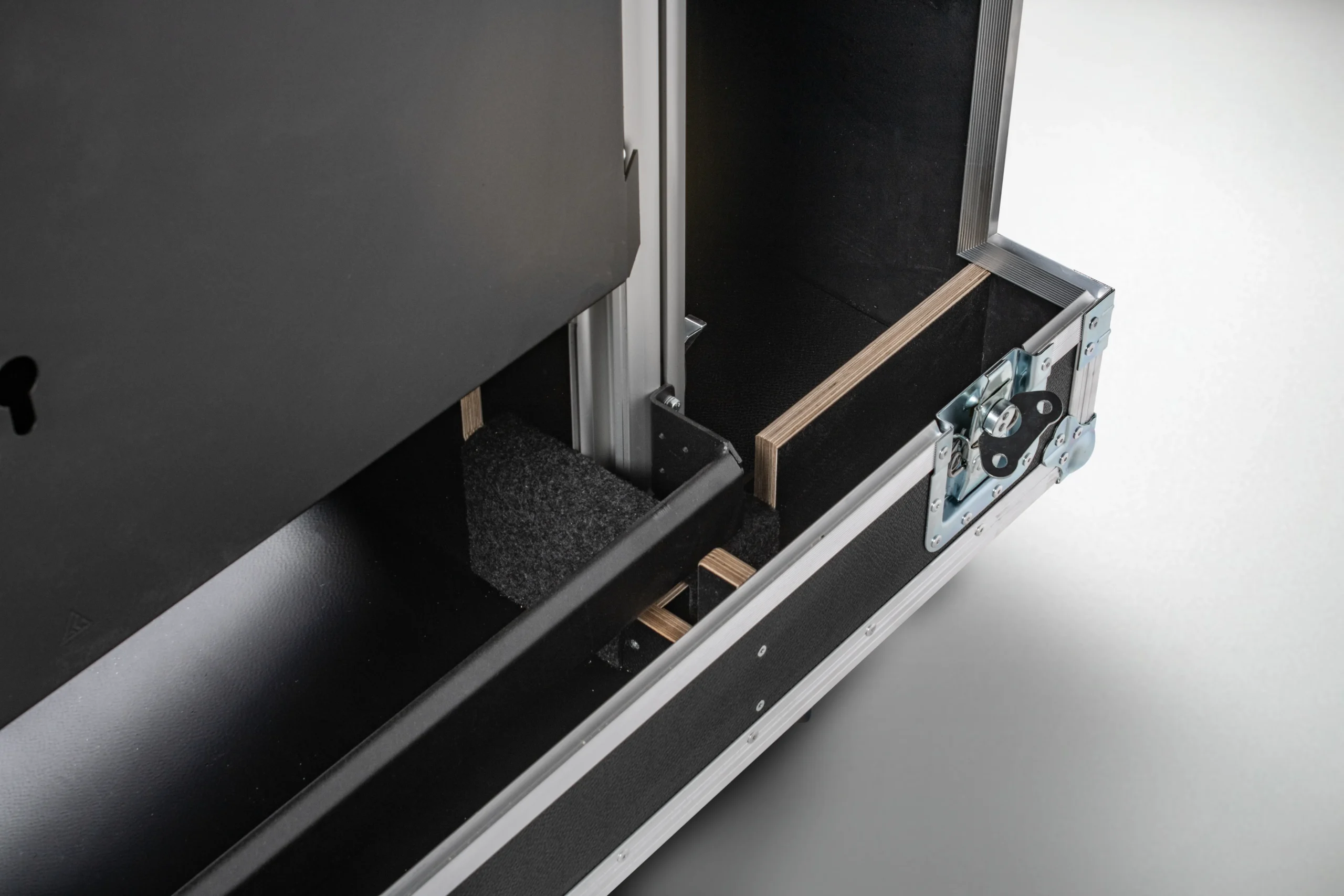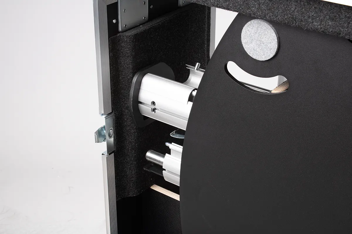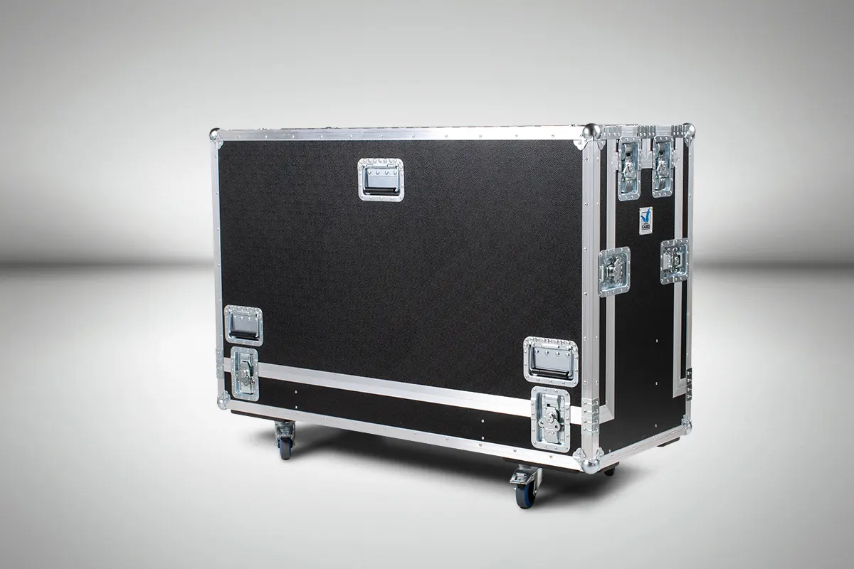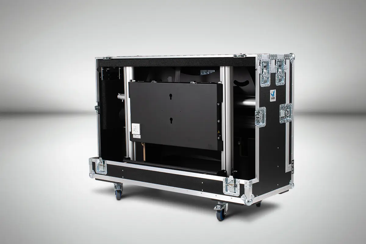 Für den elektrisch höhenverstellbaren Screen Lift FS-QR120E von Audipack haben wir ein äußerst kompaktes Flightcase entwickelt. Über die zwei abnehmbaren Deckel sind die Bodenplatte und alle Säulen direkt zugänglich und ermöglichen einen raschen Aufbau. Das „Verdeck“ lässt sich nach oben hin aufklappen um den Zugang weiter zu erleichtern.
