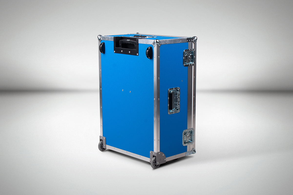 In diesem Trolleycase finden 6 Motorola Funkgeräte, 6 Mikrofonlautsprecher, 6 Akkus und eine Ladestation ihren Platz. Platz für ein Zubehörfach mit verstellbaren Trennwänden blieb auch noch. Für Rollen zu klein zum tragen zu schwer. Als Kompromiss kommen hier Eckeinbaurollen und ein ausziehbarer Tragegriff zum Einsatz. So ist es möglich, das Flightcase wie einen Reisekoffer, bequem hinter sich herzuziehen.