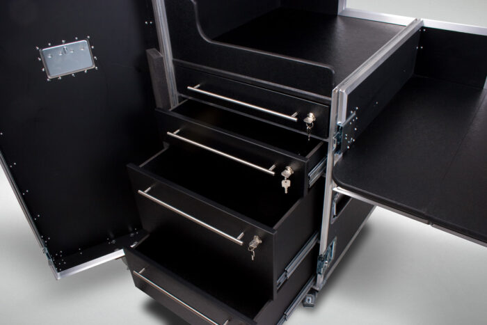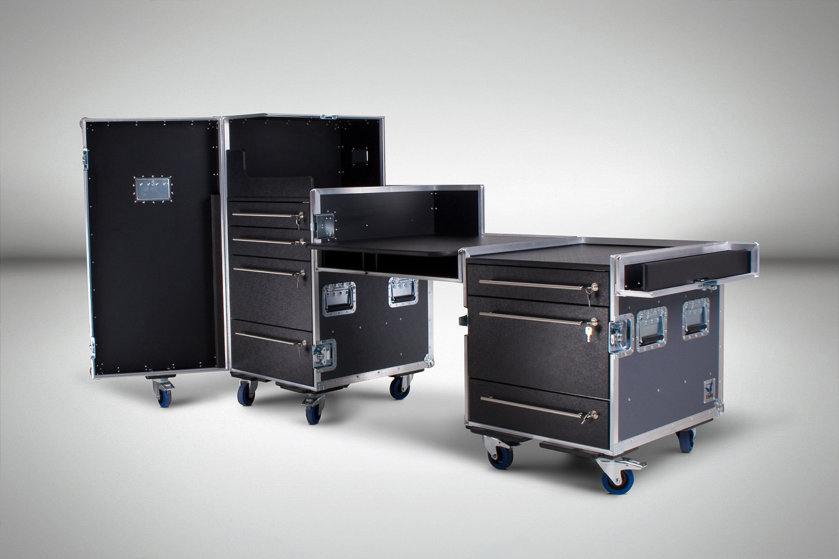 Von aussen ein robustes Case in Truckabmessungen, werden die aufgeklappten Cases werden zusammengefügt und es entsteht eine hoch belastbare durchgehende Schreibtischplatte.
